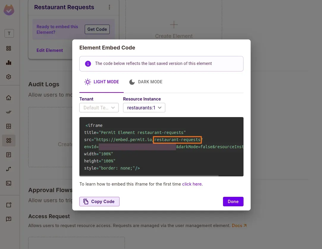 Save the ELEMENT_CONFIG_ID (e.g. restaurant-requests, dish-requests) for your .env file.